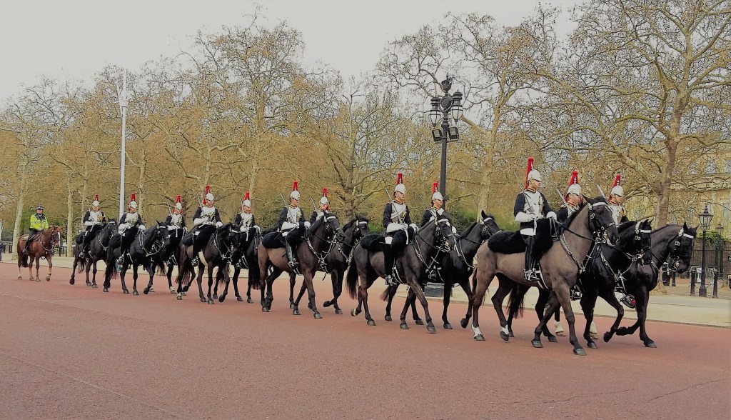 A tidal wave of people march alongside the Old Guard down The Mall. It’s fun. Join them but don’t lose the people you’re with. Pause a little further down The Mall so you can see the Household Cavalry, by now approaching from Constitution Hill. I always wait for the cavalry.