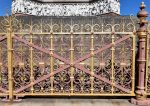 The entire memorial is enclosed at ground level within Gilbert Scott’s iron railings, painted mauve and gold, with a floral design worked into fine tracery by Francis Skidmore of Coventry (Skidmore also painted and enamelled the various heraldic shields). This perimeter forms a perfect square around the granite steps which lead up to the ciborium. Breaking the railings, in each corner, stand giant sculptures. Each sculpture represents a continent whose goods were shown at the Great Exhibition: