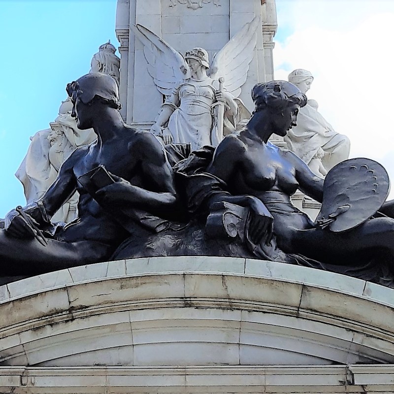 Queen Victoria – is wearing a small crown and holding an orb surmounted by George and the Dragon in her left hand. In her right hand she holds a sceptre (faces The Mall). Carrara Marble.