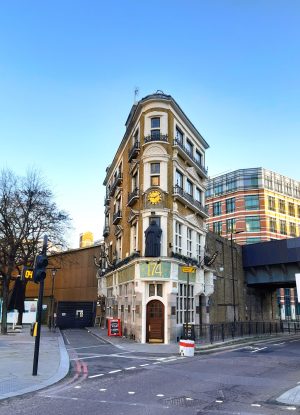 The Blackfriars pub dates from the 1870s and was remodelled during the early 20th century. Its design is ‘arts & crafts meets mock art nouveau’. Vaulted, mirrored, gilded, enamelled and mosaiced inside and with a sculpture of a laughing friar above the entrance, it ‘dizzies the drinker’.