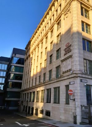 The curved ground floor is quite austere with no windows, to block out street noise. The giant ionic columns between the fourth and sixth floors create a dominating landmark building visible from all angles. The two corner entrances have large sculptures above the doors called ‘Controlled Energy: man and horse’ and ‘Controlled Energy: woman and horse’.